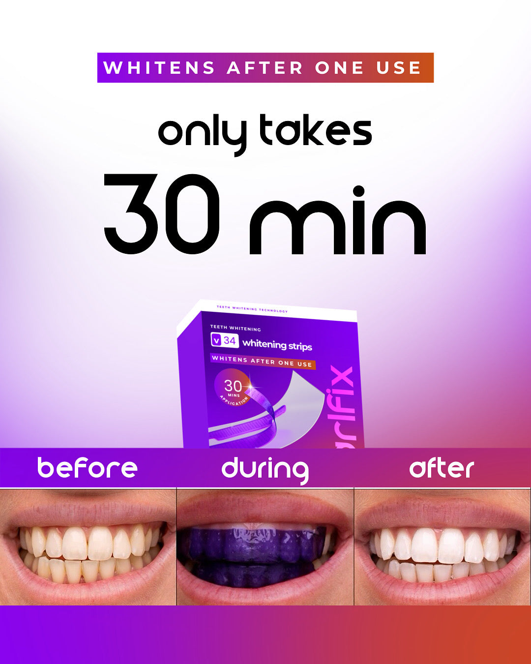 These advanced whitening strips utilize innovative colour correction technology, featuring a purple pigment that neutralizes yellow tones. Combined with a gentle PAP+ formula, they effectively target surface stains, transforming your teeth into a dazzling white in just 30 minutes.